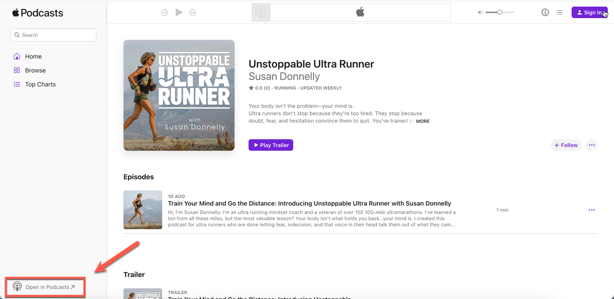To follow in Apple Podcasts, visit the Unstoppable Ultra Runner podcast page and click on “Open in Podcasts” on the lower left.